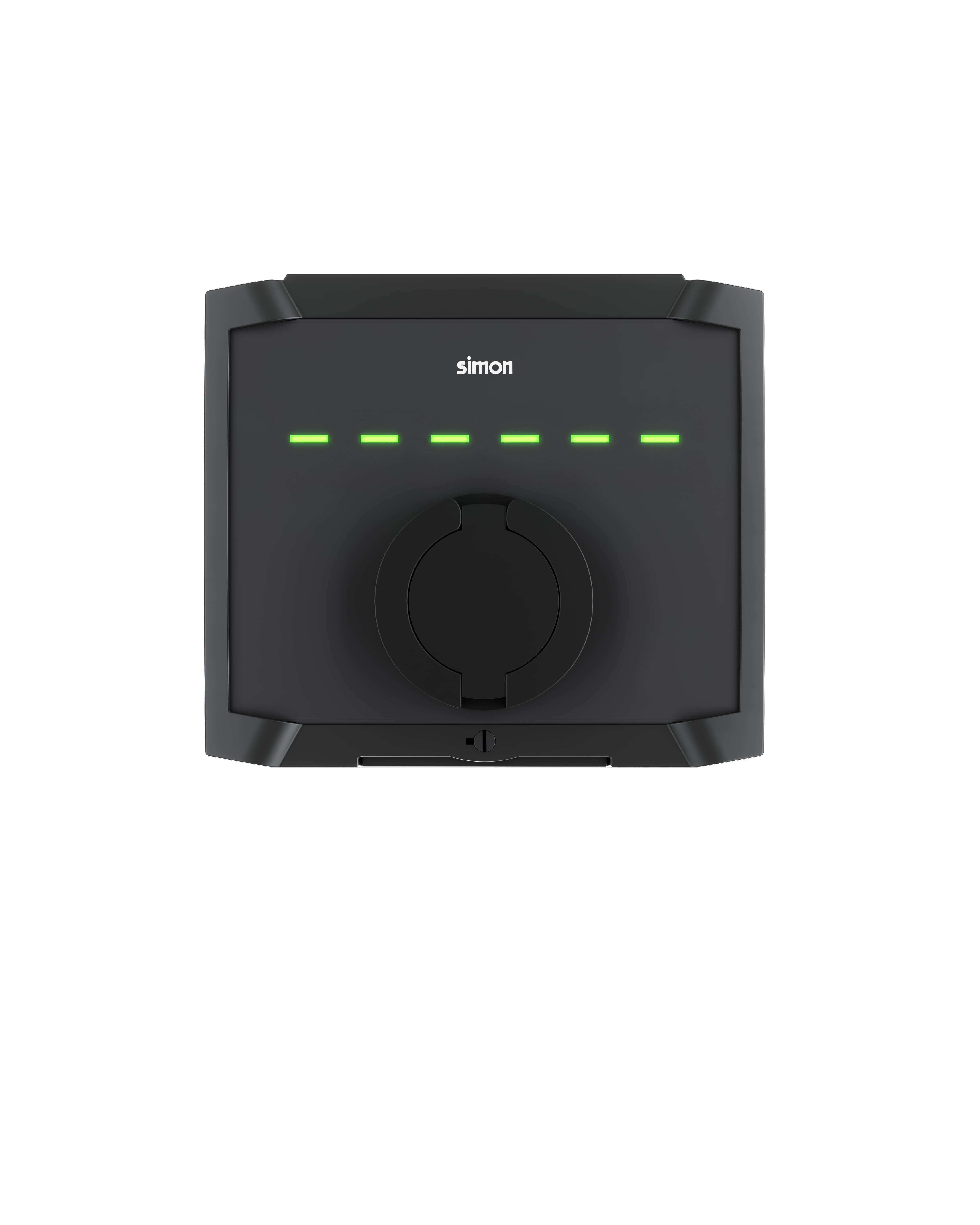 Punto de recarga SIMON Serie SM40 RESIDENTIAL, de montaje en pared.Toma tipo 2 con bloqueo de conector para evitar su extracción. Potencia máxima por toma de 22 kW (Trifásico 230 V, 50 Hz) configurable a potencias inferiores mediante selector de potencia manual. Modo 3 de carga según EN 61851-1. Incluye contador MID. Compatibilidad conmódulo de comunicaciones bluetooth. Gestión del punto mediante APP Bluetooth Plug&Drive para programación horaria del punto de recarga, configuración y activación-desactivación. Compatibilidad con modulador de potencia para gestión dinámica respecto a consumo de la vivienda. Compatibilidad con modulador dinámico para instalaciones fotovoltaicas. Dispone de toroidal interno para obtención de estadísticas en caso de conexión con APP Bluetooth. LED RGB indicador de estado por código de colores en la parte frontal. Envolvente de ABS IK10 e IP54 apto para la instalación en interior o exterior, de 324 x 700 x 146 mm. Acabado estándar SIMON. Compatible con accesorio Electron Manager para gestión de potencia y de usuarios en instalaciones comunitarias. Comunicación RS485 para gestión mediante Electron Manager. Compatible con accesorio lector de tarjetas RFID ISO 14443A/Mifare – 13.56 MHz.