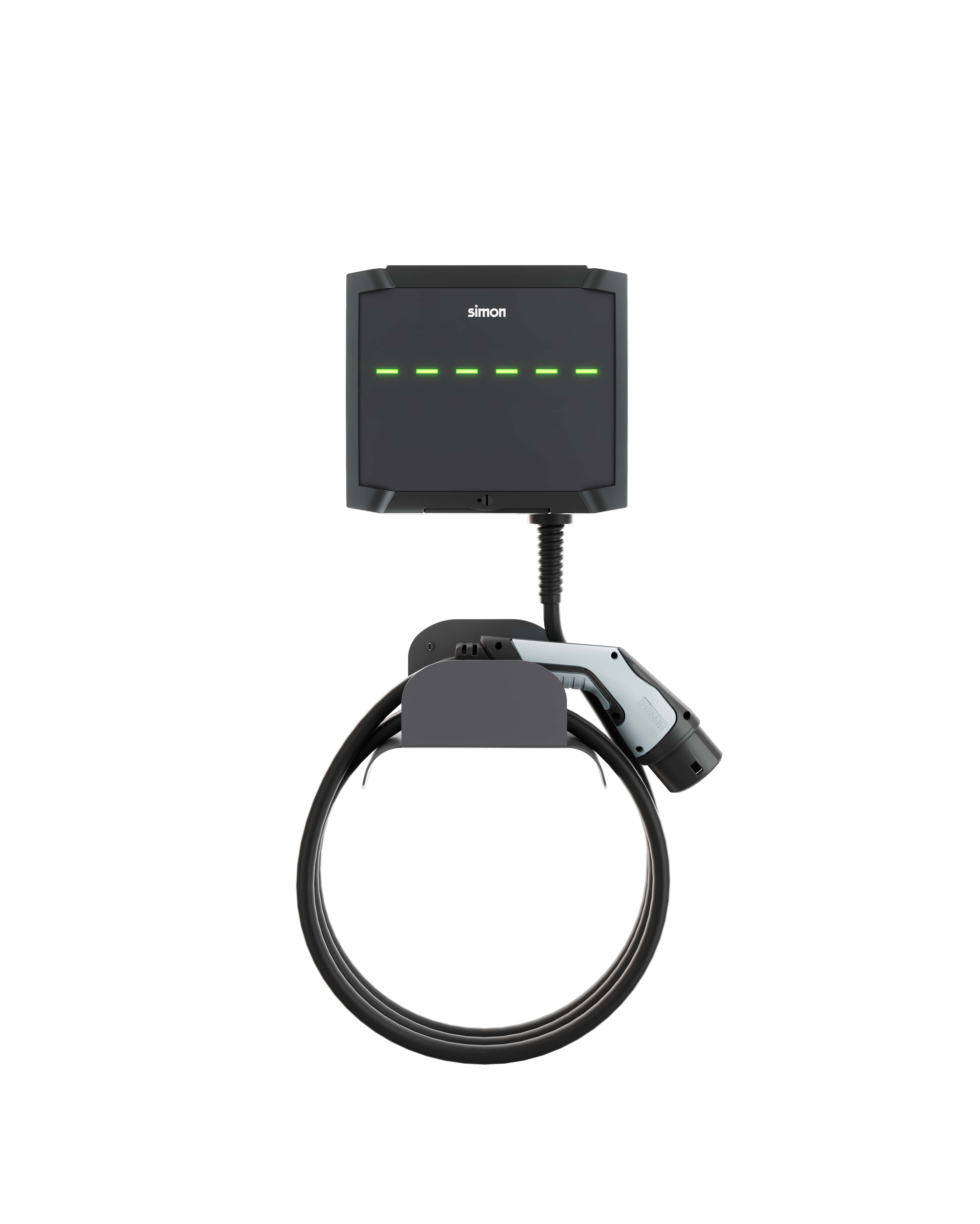 Punto de recarga SIMON Serie SM40 RESIDENTIAL, de montaje en pared. Cable de 5 m tipo recto con conector tipo 2.Potencia máxima por toma de 22 kW (Trifásico 230 V, 50 Hz) configurable a potencias inferiores mediante selector de potencia manual. Modo 3 de carga según EN 61851-1. Incluye contador MID. Compatibilidad conmódulo de comunicaciones bluetooth. Gestión del punto mediante APP Bluetooth Plug&Drive para programación horaria del punto de recarga, configuración y activación-desactivación. Compatibilidad con modulador de potencia para gestión dinámica respecto a consumo de la vivienda. Compatibilidad con modulador dinámico para instalaciones fotovoltaicas. Dispone de toroidal interno para obtención de estadísticas en caso de conexión con APP Bluetooth. LED RGB indicador de estado por código de colores en la parte frontal. Envolvente de ABS IK10 e IP54 apto para la instalación en interior o exterior, de 324 x 700 x 146 mm. Acabado estándar SIMON. Compatible con accesorio Electron Manager para gestión de potencia y de usuarios en instalaciones comunitarias. Comunicación RS485 para gestión mediante Electron Manager. Compatible con accesorio lector de tarjetas RFID ISO 14443A/Mifare – 13.56 MHz.