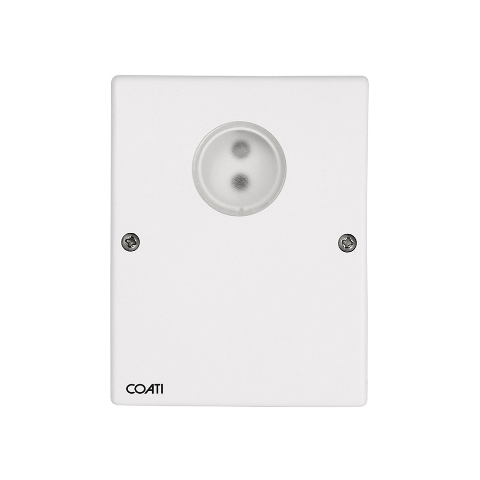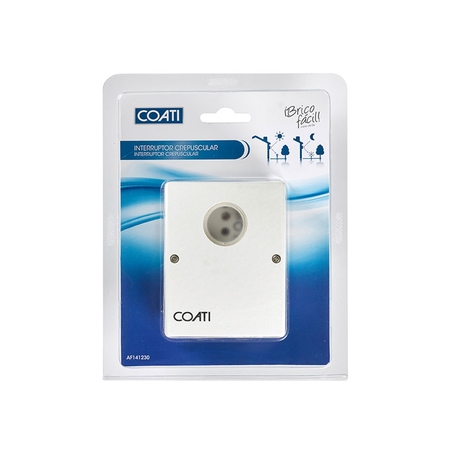Interruptor crepuscular COATI en color blanco con conexión automática de la iluminación al oscurecer y desconexión al amanecer. El detector es ajustable para que la iluminación se conecte cuando el nivel de luz en el ambiente sea inferior al umbral fijado. Además, cuenta con un retardo de 60 segundos para que no se desconecte con falsas alarmas como son los destellos de luz de un coche. Es ideal para lugares que se deben iluminar en función del nivel de luz en el ambiente, tanto interiores como exteriores.