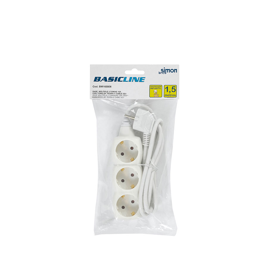 Base múltiple Basic Line de la marca SIMON BRICO de 3 tomas de 16 Amperios con toma tierra, color blanco y cable de 1,5 metros 31² incluido.