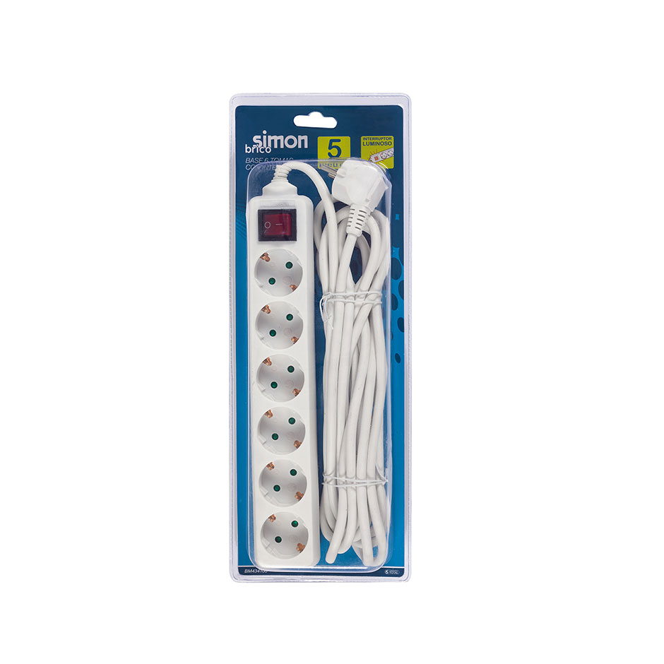 Base múltiple de 6 tomas de 16 Amperios blanca de la marca SIMON BRICO con toma tierra. Dispone de un interruptor luminoso y un cable de 5 metros 31,5².