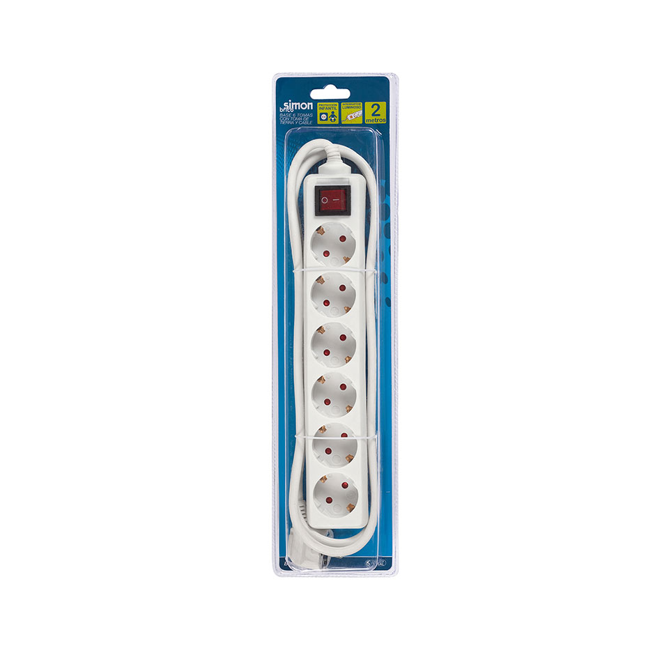 Base múltiple SIMON BRICO blanca de 6 tomas y 16 Amperios con toma tierra, interruptor luminoso rojo y cable de 2 metros 31,5².