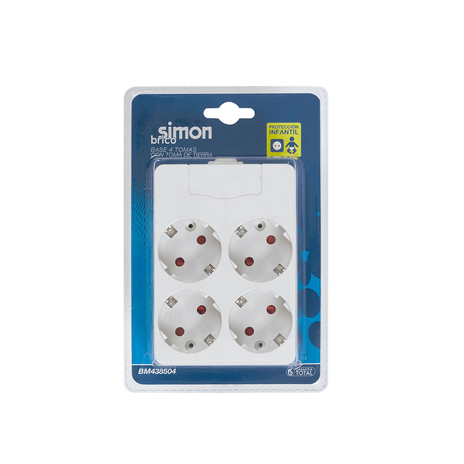 Base múltiple blanca de la marca SIMON BRICO de forma cuadrada de 4 tomas de 16 Amperios con toma tierra. Dispone de unos orificios para poder fijar en la pared o cualquier otra superficie. Un dato importante es que no incluye cable para que el propio usuario añada la longitud de cable que necesite para su perfecta instalación.