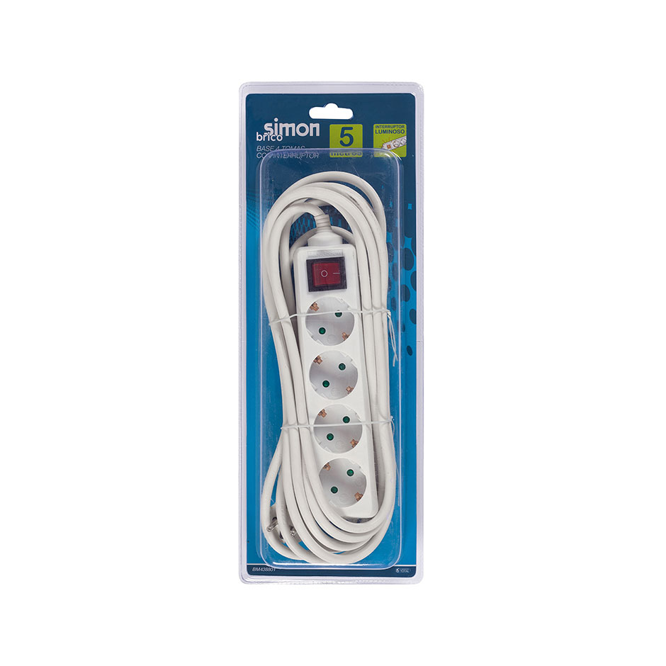Base múltiple de color blanco de la marca SIMON BRICO de 4 tomas de 16 Amperios con toma tierra y interruptor luminoso. Dispone de un cable de 5 metros 31,5².