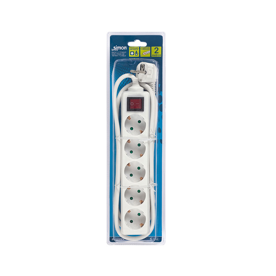 Base múltiple SIMON BRICO blanca de 5 tomas de 16 Amperios con interruptor luminoso, toma tierra y cable de 2 metros 31,5².