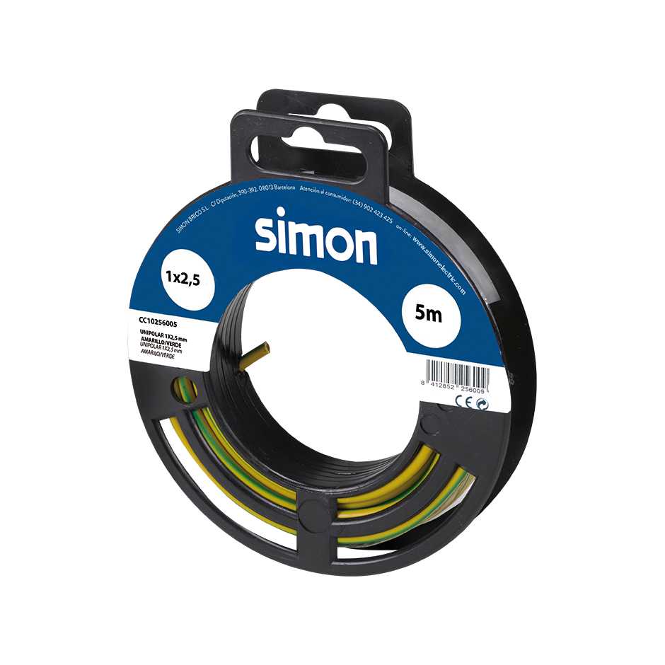 Carrete de 5 metros de cable unipolar H07V-K amarillo/verde para la función de toma tierra de 2,5mm² de diámetro con cubierta de aislamiento de PVC flexible. Soporta una tensión entre 300 y 500 Voltios. Este cable es ideal para el uso en exteriores para elementos de muy bajo consumo tales como termostatos, timbres o sistemas de seguridad.