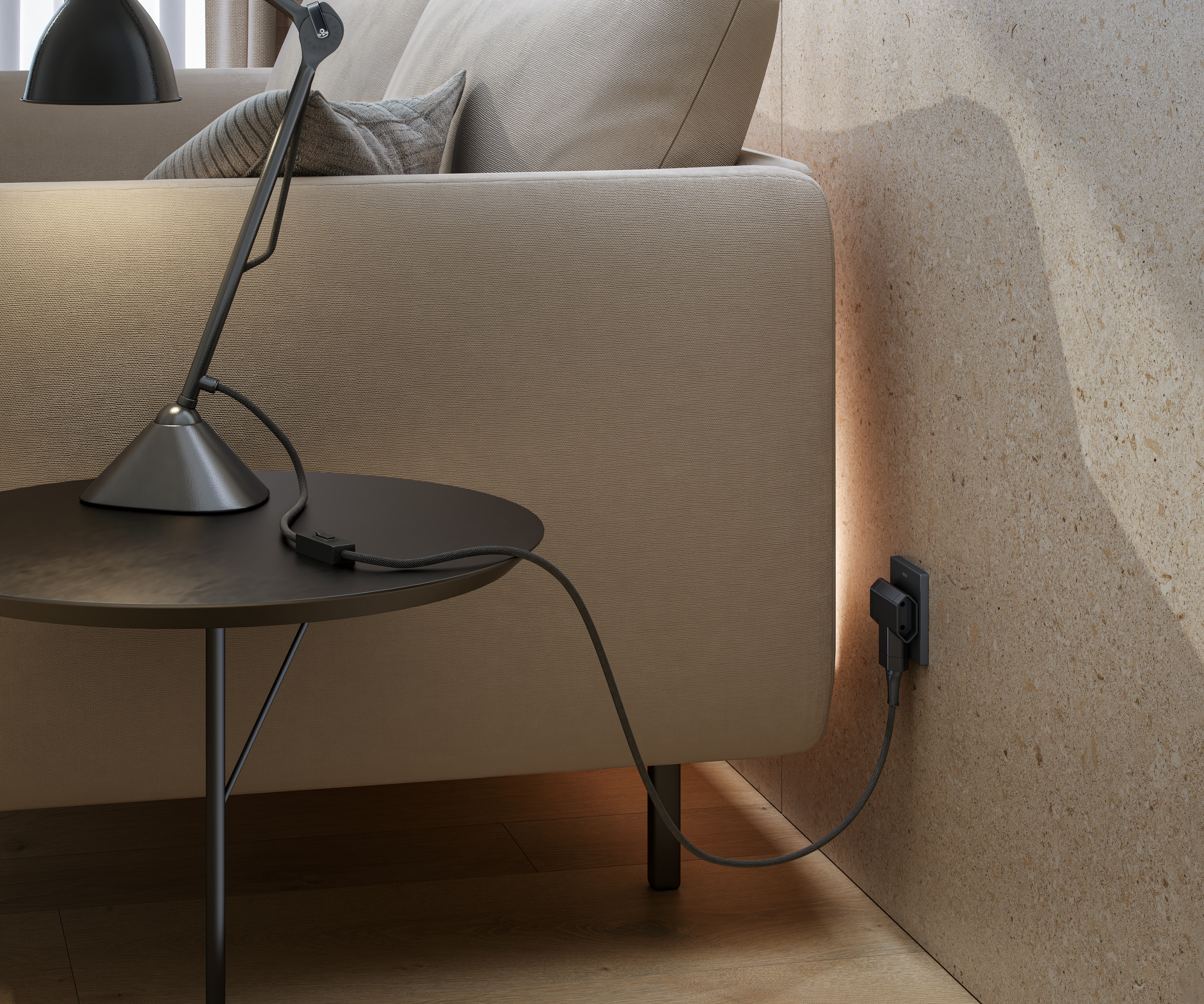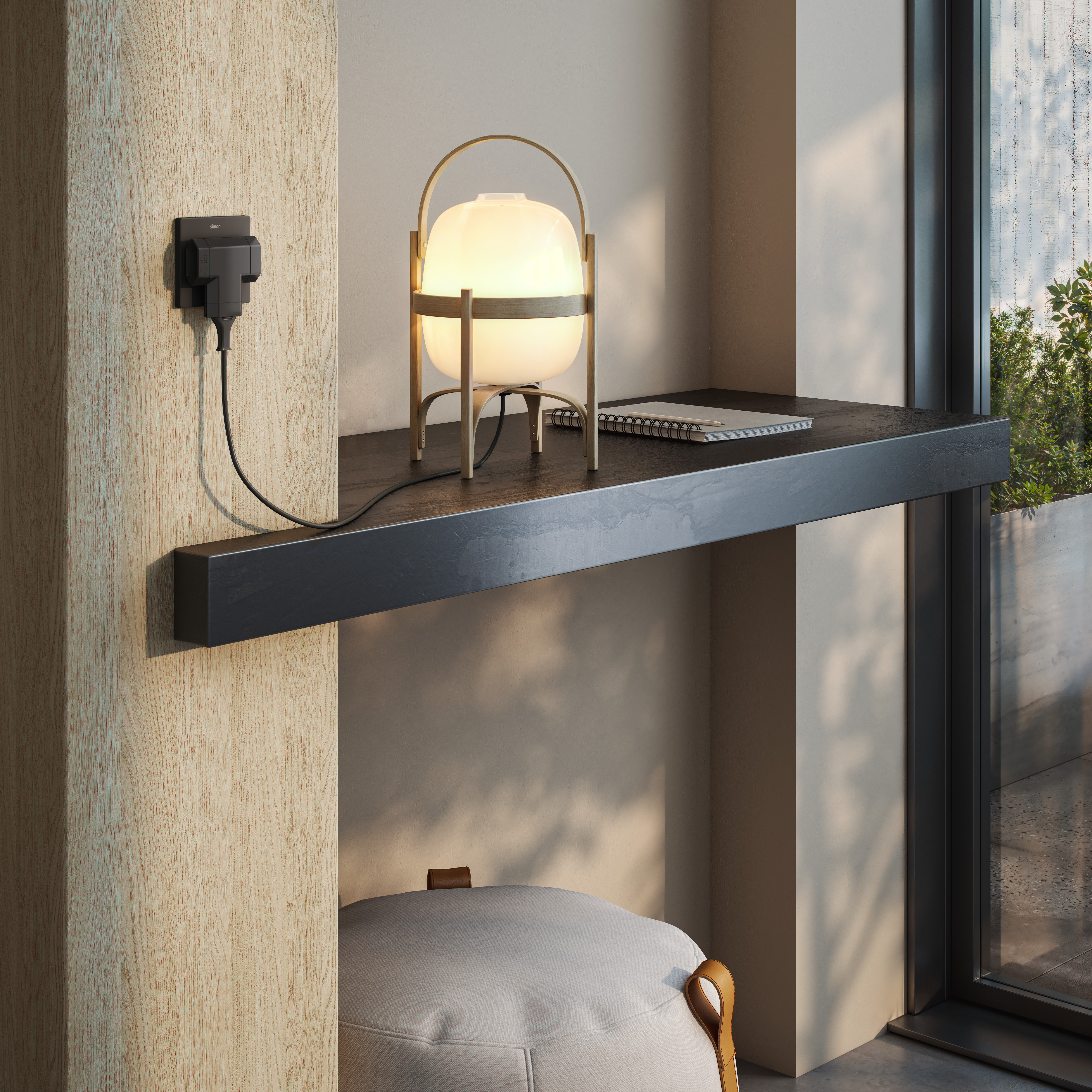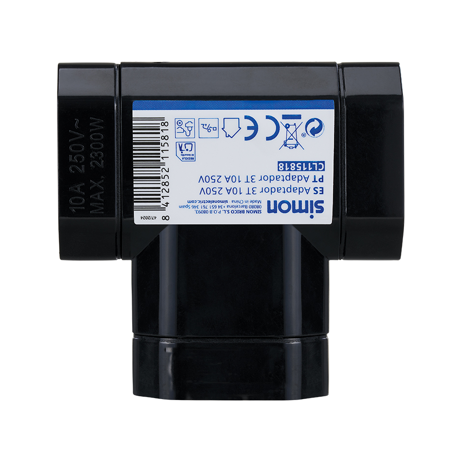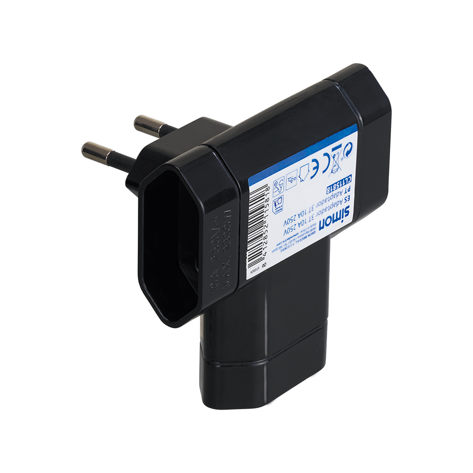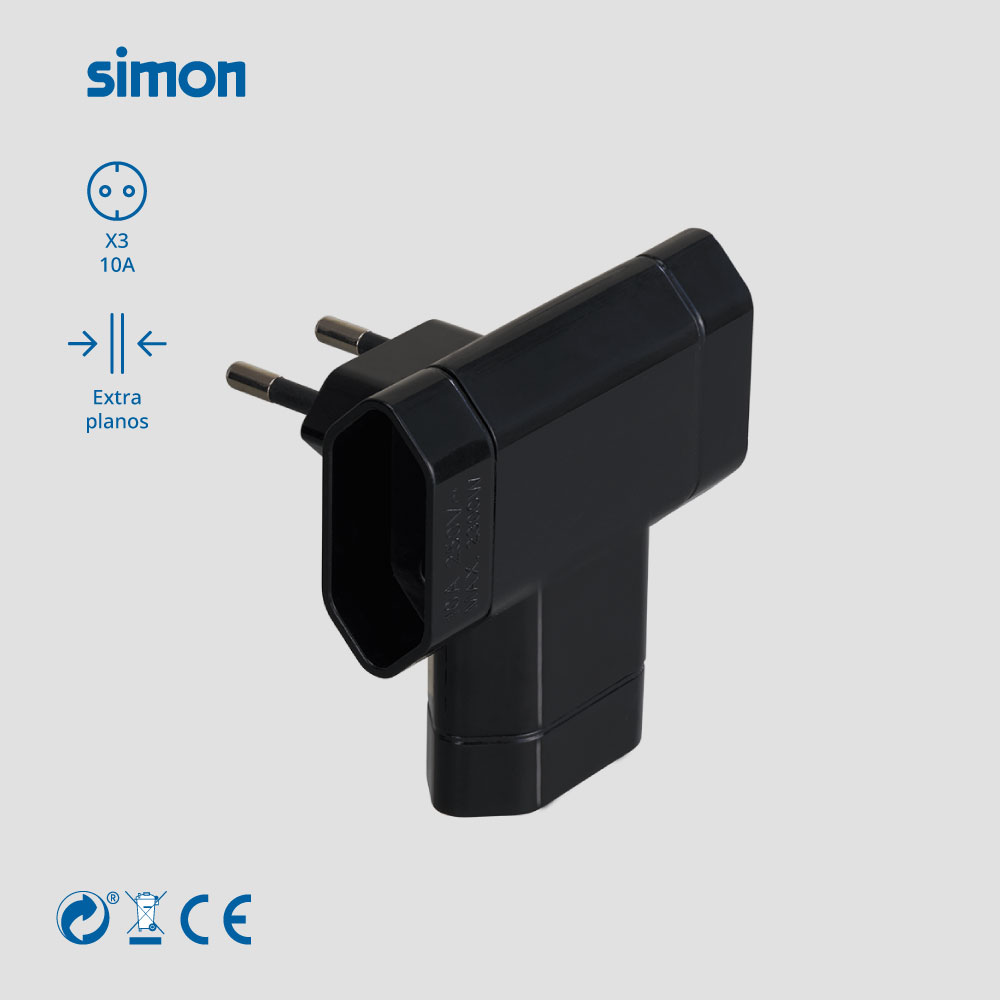 Adaptador lateral negro de SIMON con 3 tomas de 10A, ideal para lámparas y pequeños electrodomésticos. Su diseño compacto permite una colocación práctica detrás de muebles.