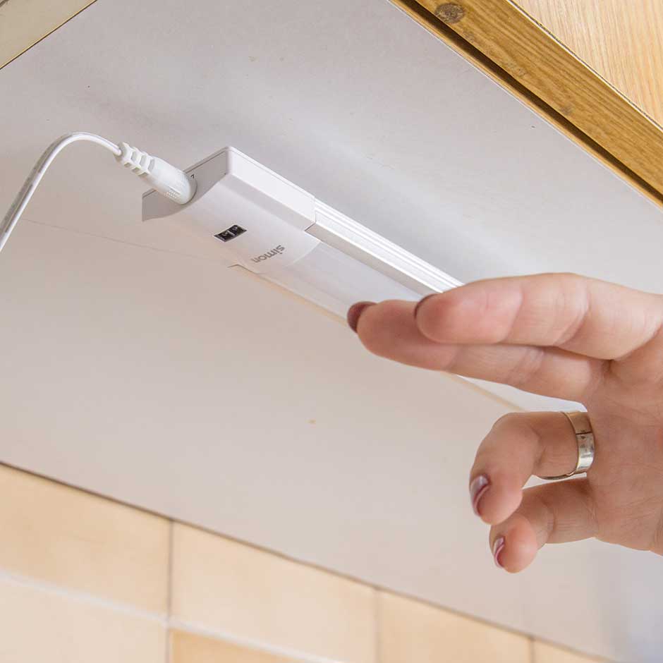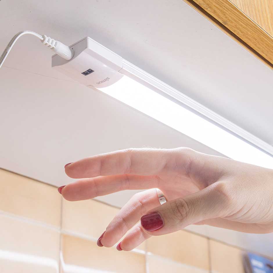 La regleta LED Calypso de SIMON está diseñada para su instalación en bajo mueble. De acabado blanco, está fabricada con aluminio y policarbonato, y dispone de un sensor infrarrojos contactless con detección hasta cinco centímetros para su conexión. También consta de un módulo no sustituible que aporta una luz blanca fría de 380 lúmenes con una potencia de 5,5 vatios, con funcionamiento mediante adaptador. Gracias a su grosor de 12,5 mm, podrás ahorrar espacio y colocarla en todo tipo de espacios. Se puede fijar mediante cinta adhesiva o tornillos (dos incluidos).