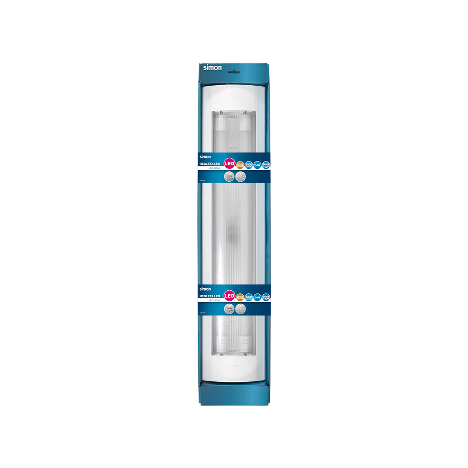 Regleta Amaltea SIMON blanca con dos tubos LED de 9 vatios cada uno sustuible que ofrece una iluminación en color blanco frío de 1800 lúmenes. Esta regleta es óptima para su instalación en techos. En el producto se incluyen 4 tornillos y 4 tacos de plástico para su idónea instalación.