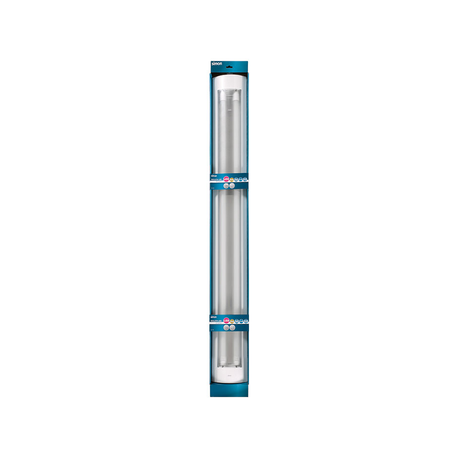 Regleta Amaltea con tecnología LED de SIMON especial para techos con acabado en blanco. La luminaria cuenta con una iluminación de 3600 lúmenes en luz blanca fría gracias a dos tubos LED de 18 vatios fácilmente sustituibles. Para su instalación se incluyen 4 tornillos y 4 tacos de plástico.