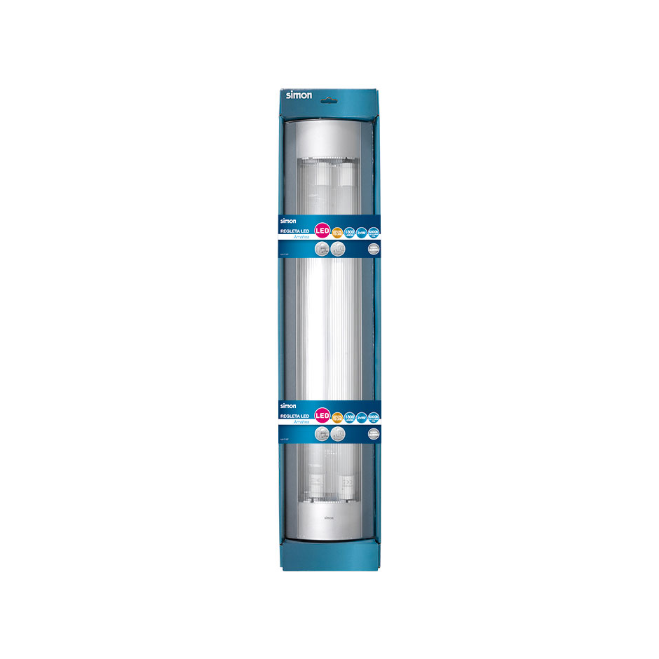 Luminaria Amaltea en aluminio de SIMON con LED de luz blanca fría especial para techos. Esta regleta aporta una iluminación de 1800 lúmenes con 2 tubos LED de 9 vatios cada uno que se pueden sustituir en el caso de agotamiento. Para su correcta instalación, en el producto están incluidos 4 tornillos y 4 tacos de plástico.