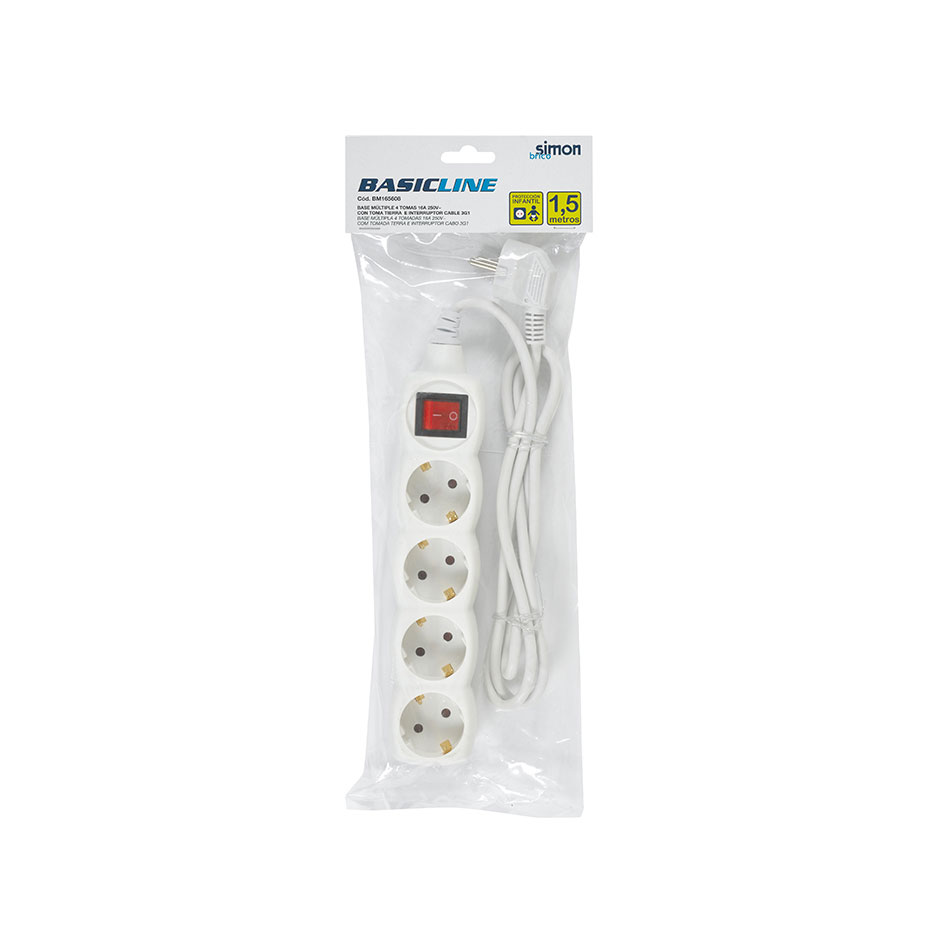 Base múltipla branca Basic Line SIMON BRICO com 4 tomadas de 16 amperes com ligação à terra, interruptor luminoso e cabo de 1,5 metros 3G 1 mm².