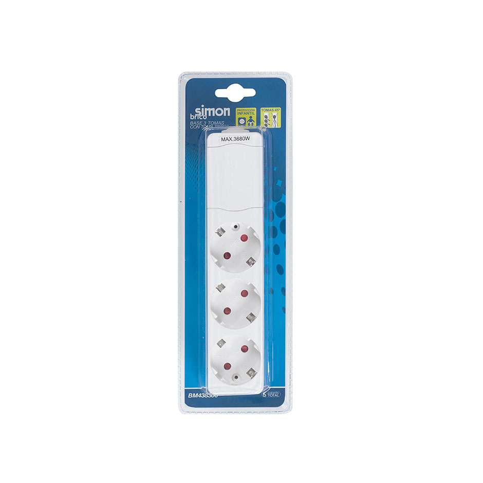 Base múltipla branca da marca SIMON BRICO. Dentro das suas características pode observar-se que contém 3 tomadas de 16 amperes com ligação à terra e não inclui cabo para que o utilizador adicione o comprimento de cabo que necessite para obter uma instalação perfeita. A base contém orifícios para poder fixar na parede ou noutra superfície.