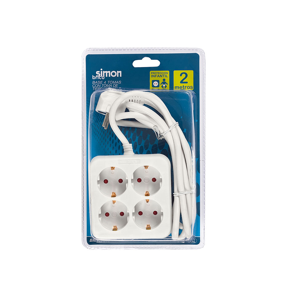 Base múltipla branca quadrada da marca SIMON BRICO com 4 tomadas de 16 amperes. Contém ligação à terra e cabo de 2 metros, 3G 1,5 mm².