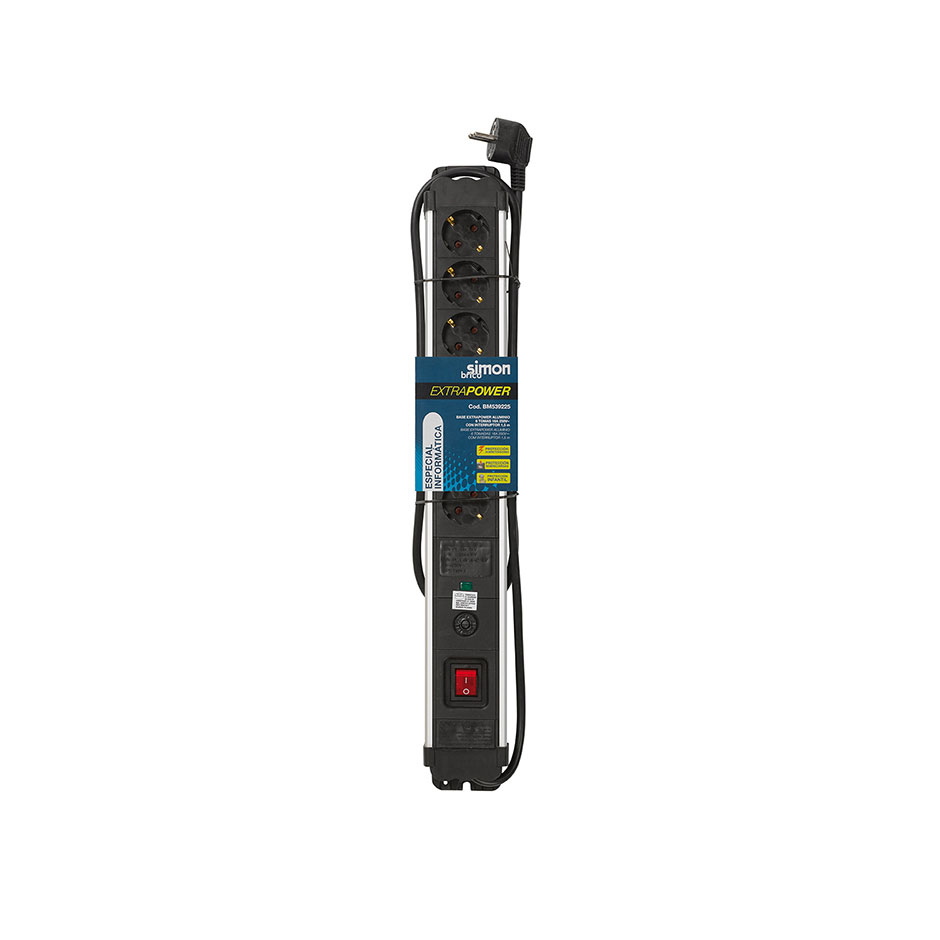 Base múltipla Extrapower em alumÃnio com 6 tomadas de 16 amperes da marca SIMON BRICO. Dentro das suas caracterÃsticas podemos encontrar a ligação à terra, um interruptor luminoso e o cabo de 1,5 metros, 3G 1,5 mm². Dispõe de um sistema de proteção para proteger os elementos ligados contra possÃveis sobretensões e sobrecargas. Também conta com um LED luminoso que informa se a proteção está ativada ou desativada. Pode ser pendurada graças a umas ranhuras numa das suas extremidades ou fixada com parafusos através de uns orifÃcios.