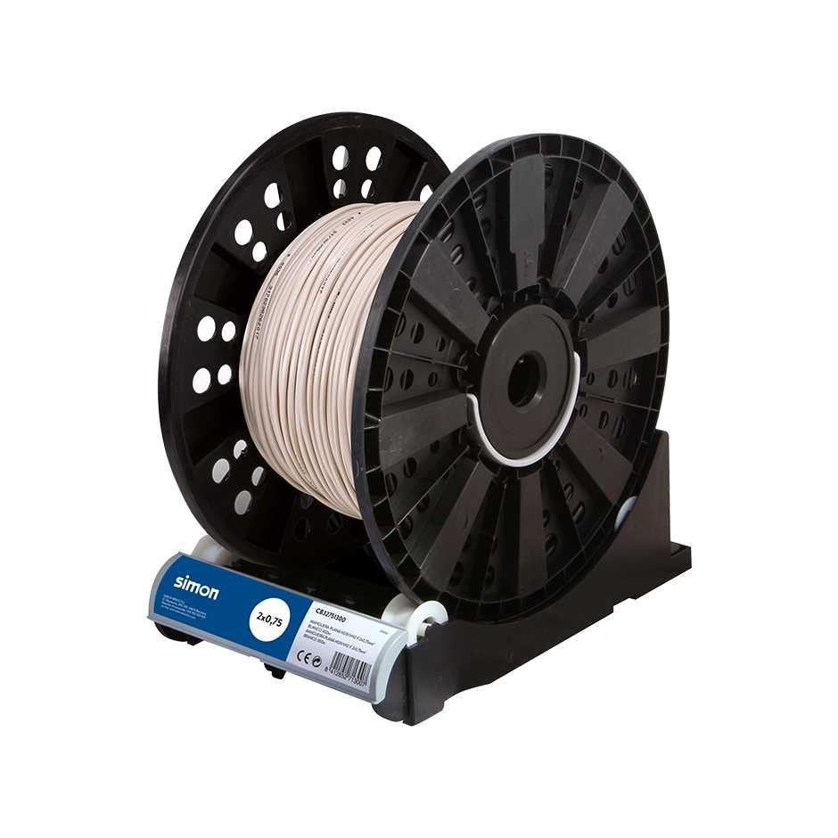 Bobina de 300 metros de cabo de mangueira plana H03VVH2-F branco de 2 fios e 0,75 mm² de diâmetro com revestimento de isolamento em PVC flexÃvel. Cabo para aplicação e alimentação de aparelhos para serviços leves de muito baixo consumo, como xxx. Suporta uma tensão de 300 volts.