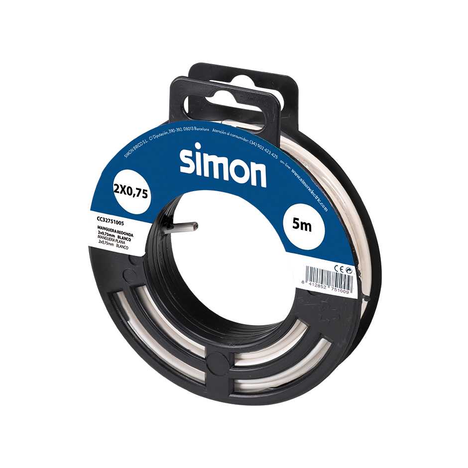 Rolo de 5 metros de cabo de mangueira plana H03VVH2-F branco de 2 fios e 0,75 mm² de diâmetro com revestimento de isolamento em PVC flexÃvel. Cabo para aplicação e alimentação de aparelhos para serviços leves de muito baixo consumo, como xxx. Suporta uma tensão de 300 volts.