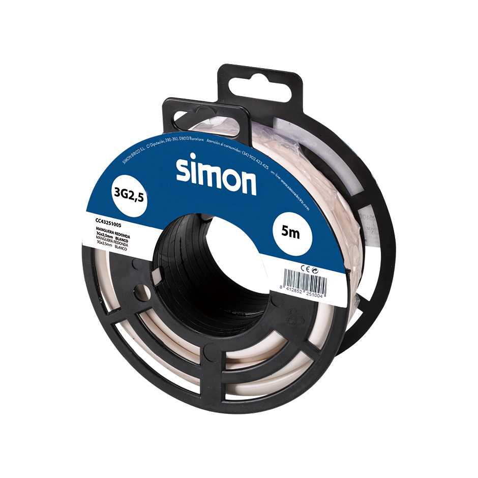 Rolo de 5 metros de cabo branco de mangueira redonda H05VV-F, de 3 fios, ligação à terra e 2,5 mm² de diâmetro com revestimento de isolamento em PVC flexÃvel. Suporta uma tensão entre 300 e 500 volts. Este cabo é ideal para elementos de médio e baixo consumo, tais como cablagem de iluminação, ligações de casa e extensões reforçadas.