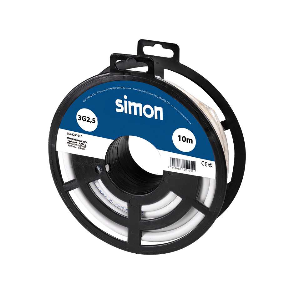 Rolo de 10 metros de cabo branco de mangueira redonda H05VV-F, de 3 fios, ligação à terra e 2,5 mm² de diâmetro com revestimento de isolamento em PVC flexÃvel. Suporta uma tensão entre 300 e 500 volts. Este cabo é ideal para elementos de médio e baixo consumo, tais como cablagem de iluminação, ligações de casa e extensões reforçadas.