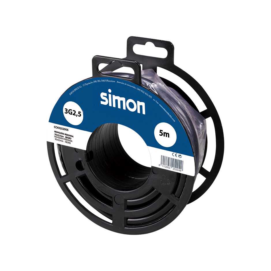 Rolo de 5 metros de cabo preto de mangueira redonda H05VV-F, de 3 fios, ligação à terra e 2,5 mm² de diâmetro com revestimento de isolamento em PVC flexÃvel. Suporta uma tensão entre 300 e 500 volts. Este cabo é ideal para elementos de médio e baixo consumo, tais como cablagem de iluminação, ligações de casa e extensões reforçadas.