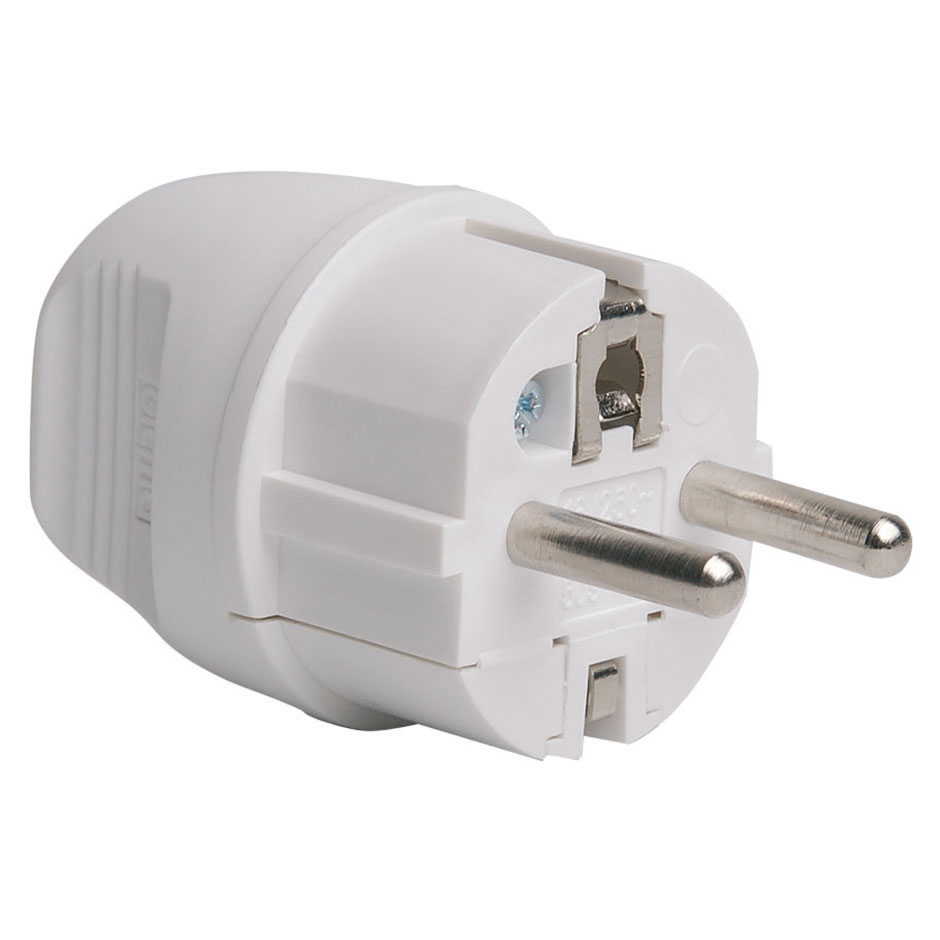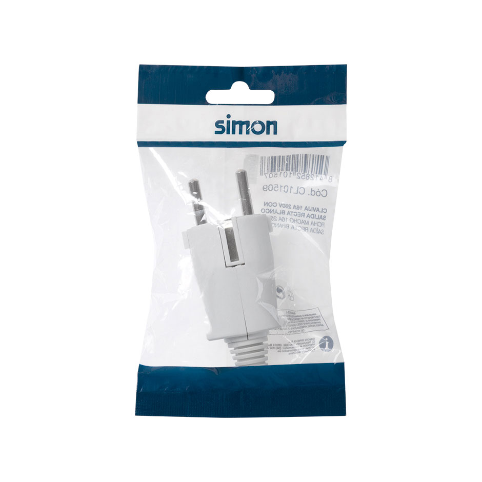 Ficha branca de 16 amperes e 250 V com ligação à terra da marca SIMON. SaÃda de cabo reta e encaixe fácil para ligação ideal.