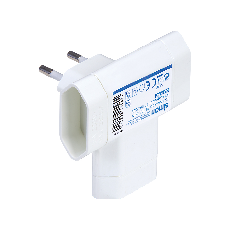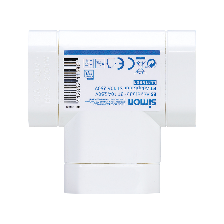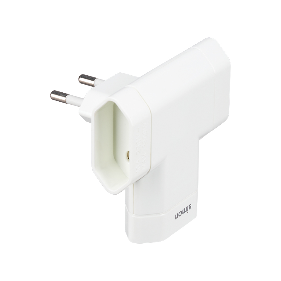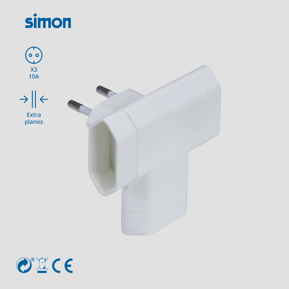 Adaptador lateral branco da SIMON com 3 tomadas de 10A, ideal para lâmpadas e pequenos electrodomésticos. Seu design compacto permite uma colocação prática atrás dos móveis.