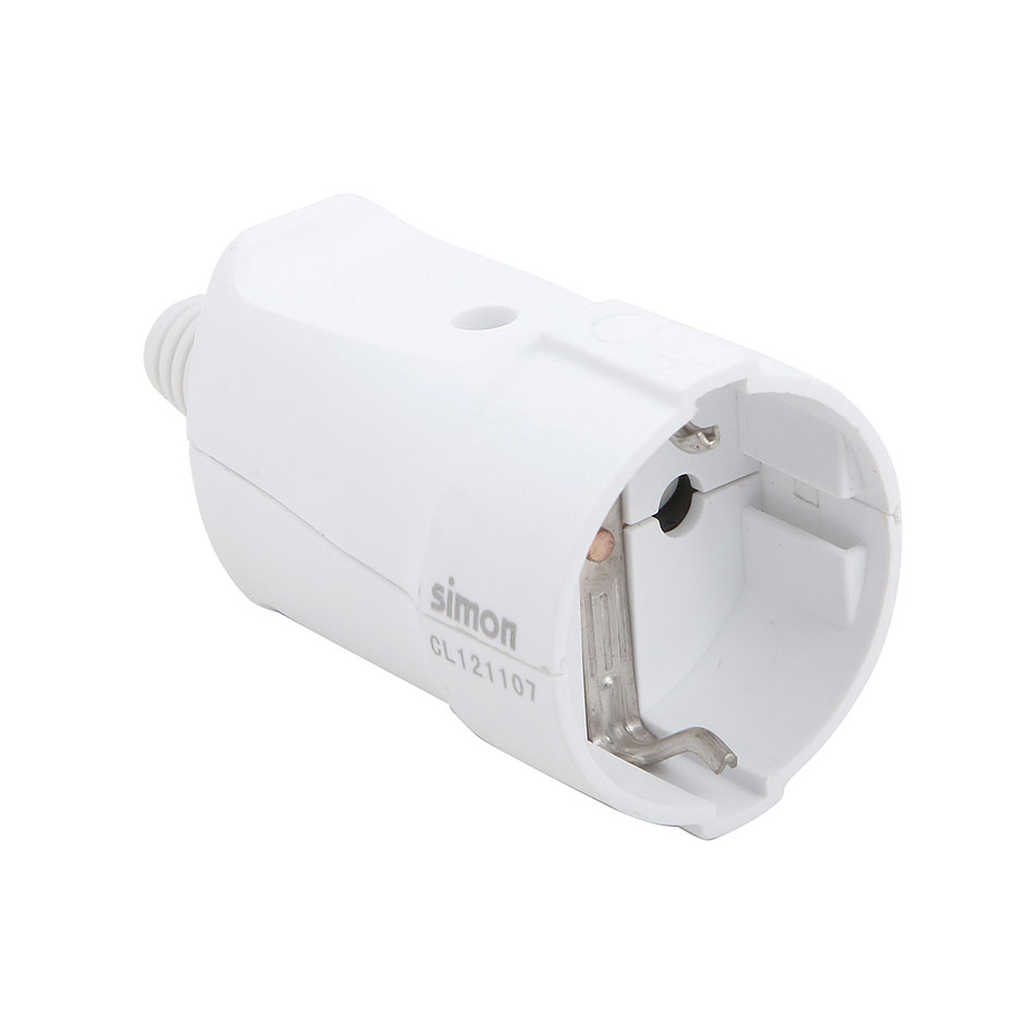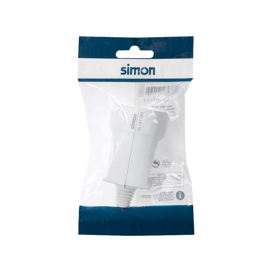 Base móvel branca de 16 amperes e 250 V SIMON com saÃda de cabo reta. Para utilização com extensão, com contactos de terra laterais schuko. Fornecida em bolsa para pendurar na prateleira.