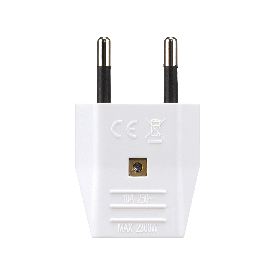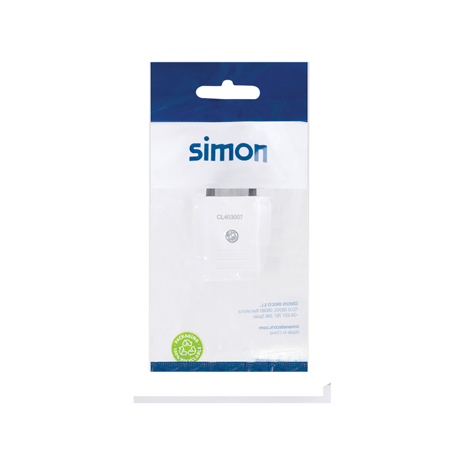 Ficha branca de 10 amperes e 250 V com saÃda de cabo reta da marca SIMON BRICO. Fornecida em blister para pendurar na prateleira.
