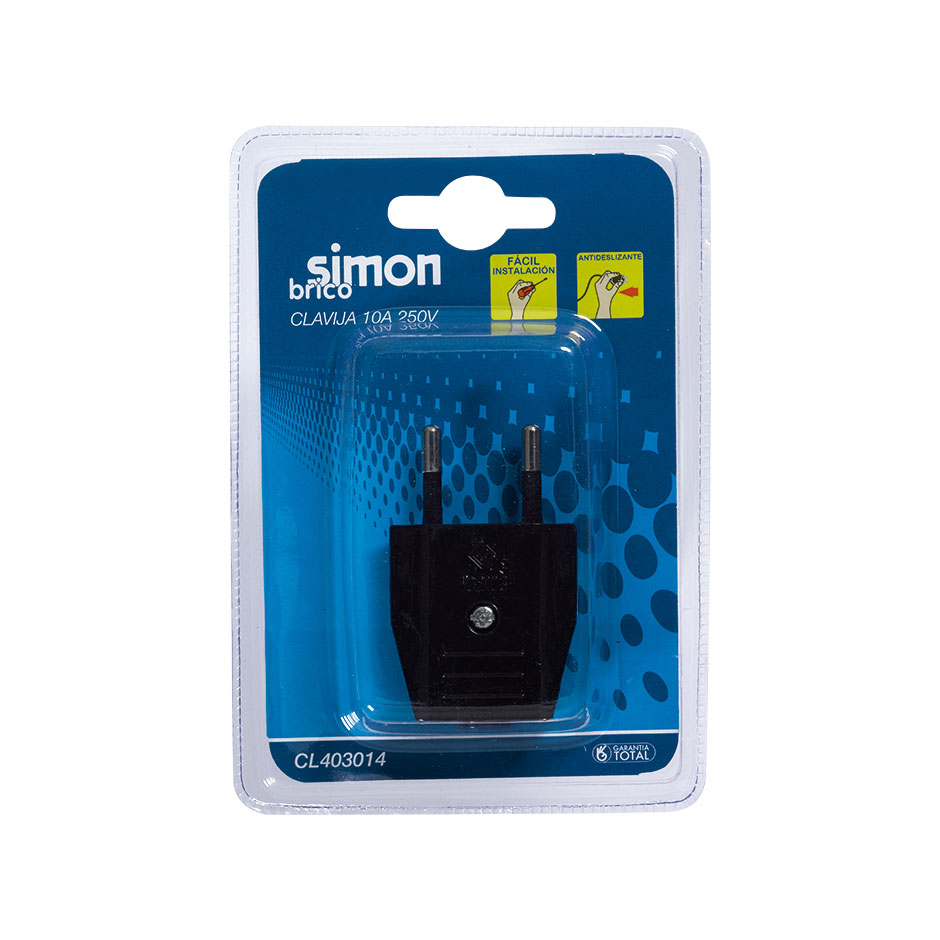 Ficha de 10 amperes e 250 V da SIMON BRICO com acabamento em preto e saÃda de cabo reta. Apresentação em embalagem de blister para pendurar na prateleira.