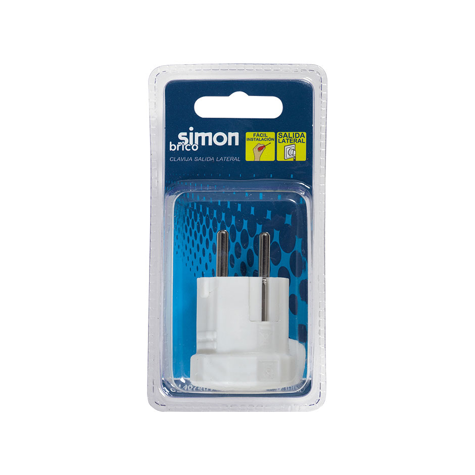 Ficha preta de 16 amperes e 250 V com ligação à terra da SIMON BRICO. A saÃda de cabo lateral permite a utilização em tomadas com espaços reduzidos. Apresentada em blister.