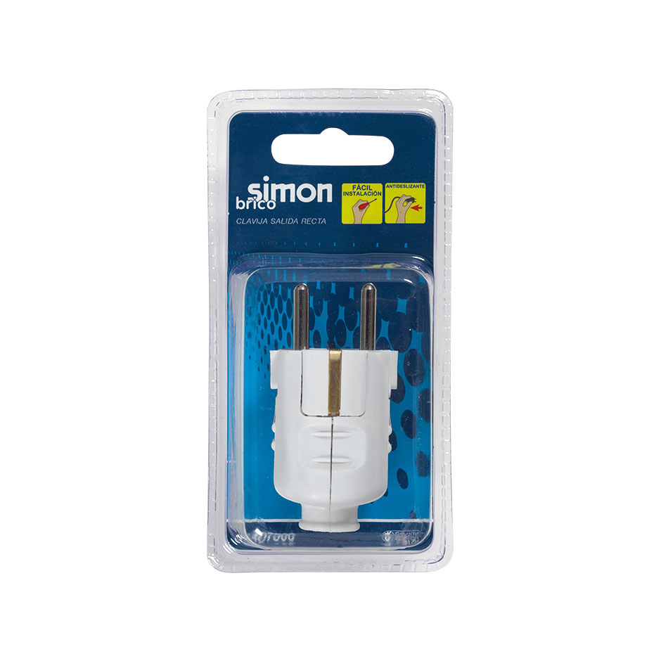 Ficha SIMON BRICO de 16 amperes e 250 V com acabamento em branco e com tomada e saÃda de cabo reta. Única num cabo elétrico, permitindo modelar uma extensão com o comprimento desejado. A sua embalagem em blister permite mostrar o produto de forma cómoda na prateleira.