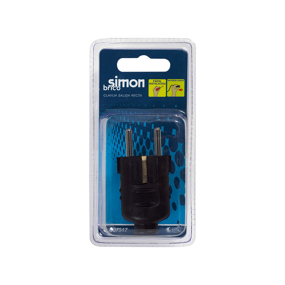 Ficha de 16 amperes e 250 V com ligação à terra. É apresentada em acabamento preto e conta com saÃda de cabo reta. Marca SIMON BRICO. Fornecida em blister para mostrar o produto no ponto de venda.