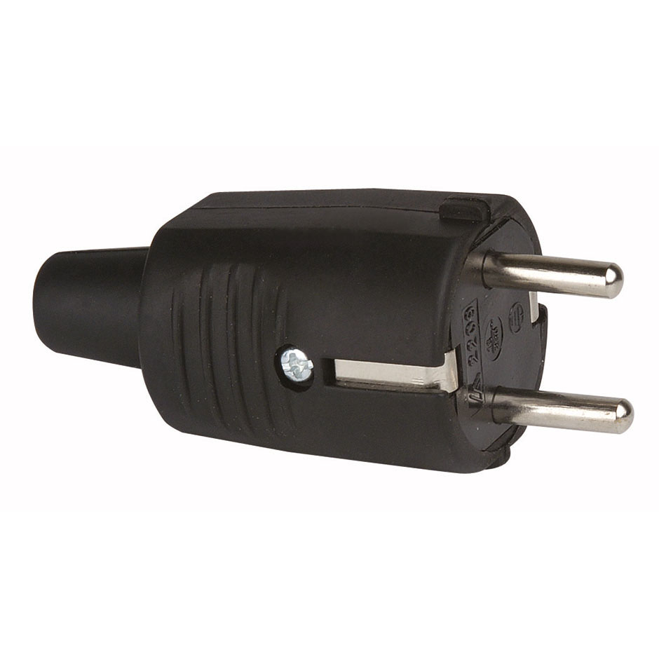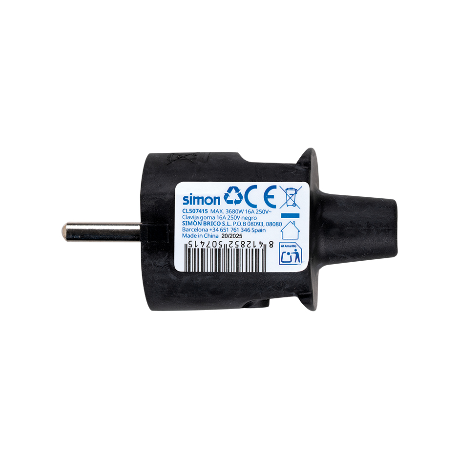 Ficha preta de 16 amperes e 250 V, com ligação à terra, da marca SIMON BRICO. SaÃda de cabo central. Fabricada em borracha, proporcionando assim uma maior resistência e flexibilidade ao produto e tornando-o resistente em diferentes ambientes. É apresentada numa embalagem retráctil transparente.