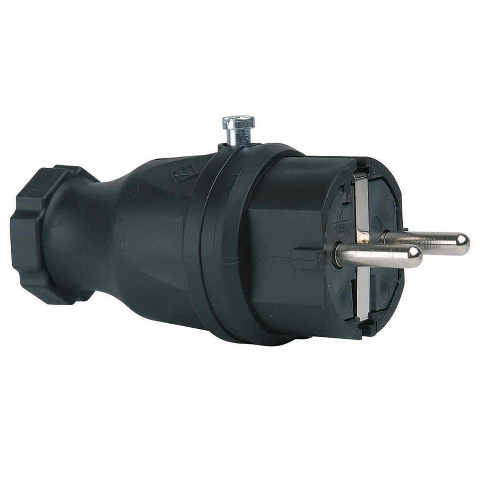 Ficha de borracha preta da marca SIMON BRICO com 16 amperes e 250 V com ligação à terra. A base pode ser utilizada em ambientes exigentes graças à sua alta proteção face à água e ao seu fabrico em borracha, o que proporciona à ficha uma grande resistência e flexibilidade. É apresentada numa embalagem em plástico, retráctil e transparente.