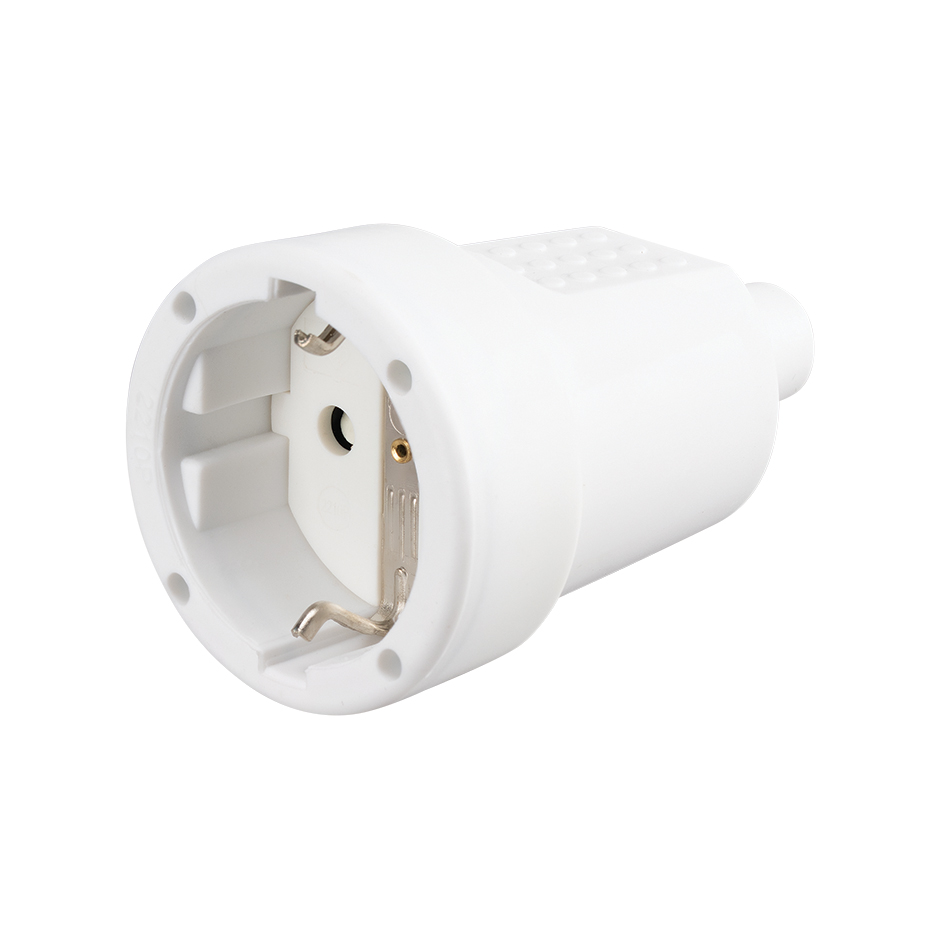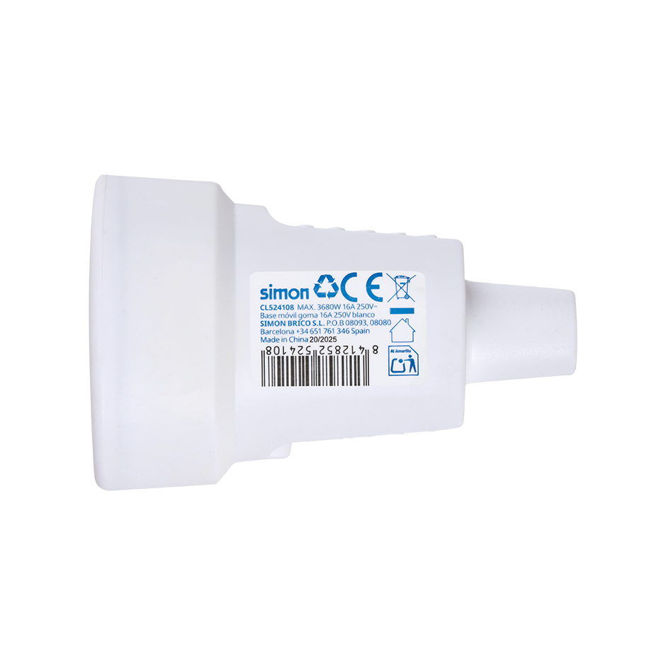 Base móvel de borracha branca com saÃda de cabo reta de 16 amperes de 230 V e ligação à terra. A estrutura de borracha da base de tomada aérea da SIMON BRICO proporciona ao produto flexibilidade e resistência ao mesmo tempo. Em plástico retráctil.