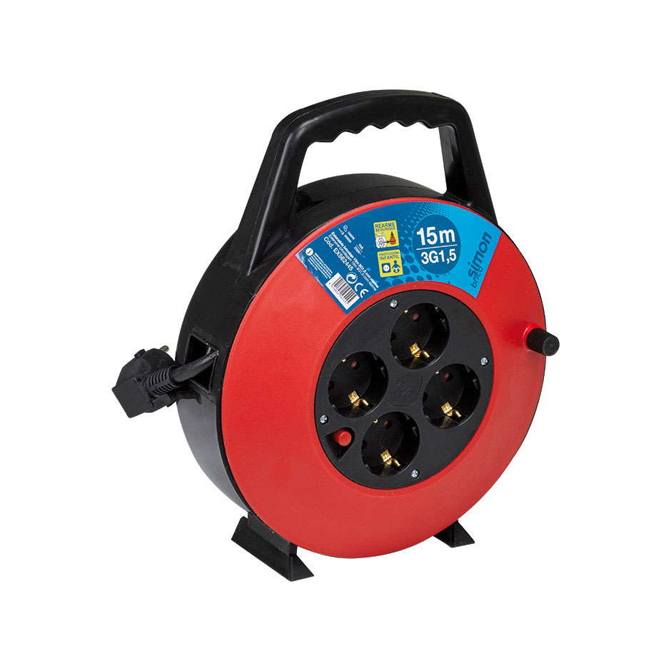 Este enrolador de cabo compacto vermelho e preto para uso doméstico, com um cabo de 15 metros de comprimento, com uma secção de 3G 1,5 mm² é fácil de transportar graças à sua pega. A extensão com enrolador de cabo da SIMON BRICO oferece ligação para 4 tomadas de 16 amperes com ligação à terra e está equipada com religação de segurança.
