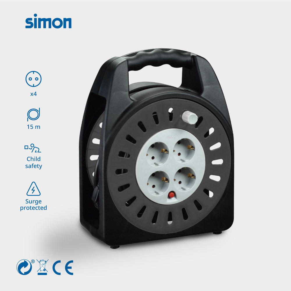 EXTENSÍVEL DOMÉSTICO 15M H05VV-F 3G1.5MM² 4 TOMADAS 16A 230V~ PRETO/CINZA SIMON